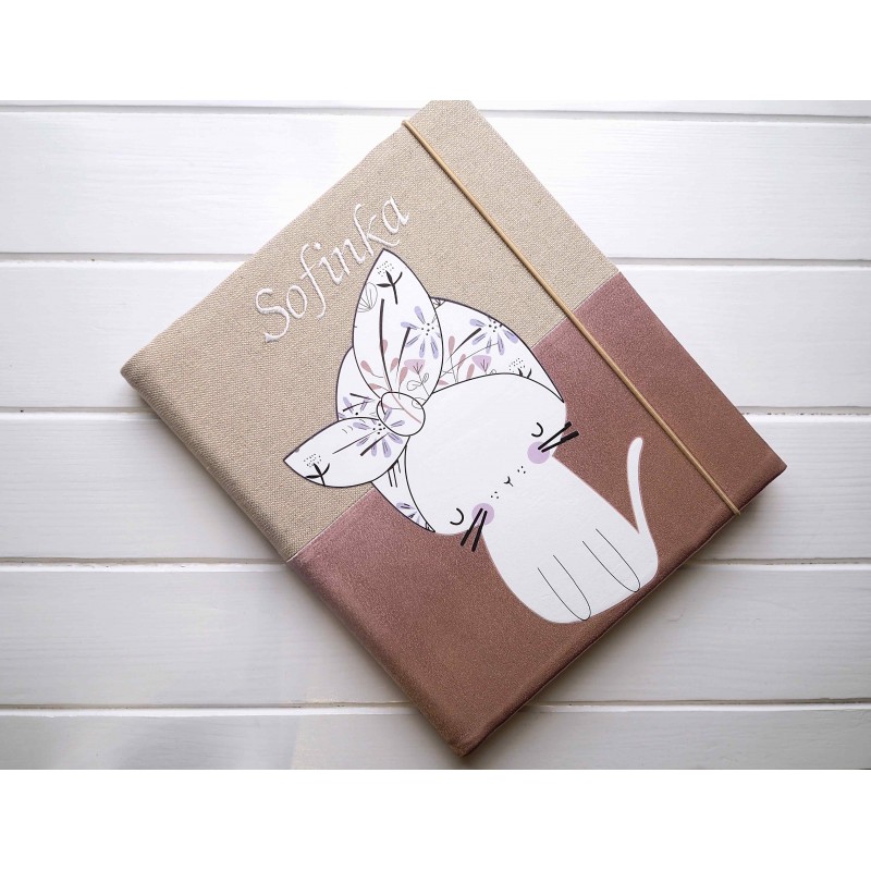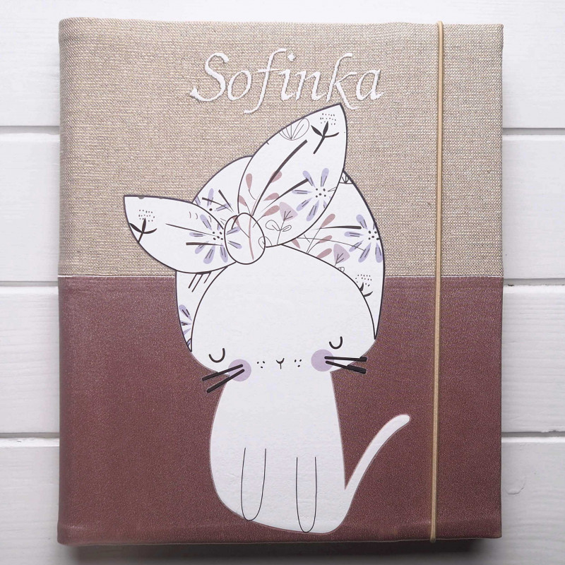 Pro holčičku, která miluje kočičky a jemné „girly“ detaily, je tohle album úplně roztomilé – spokojená kočička se zavřenými očičky, velká mašle s drobným vzorem a elegantní kombinace béžové s třpytivým růžovým spodním dílem. Se jménem vyšitým na obálce z něj bude osobní album, ke kterému se bude ráda vracet.