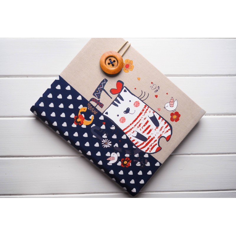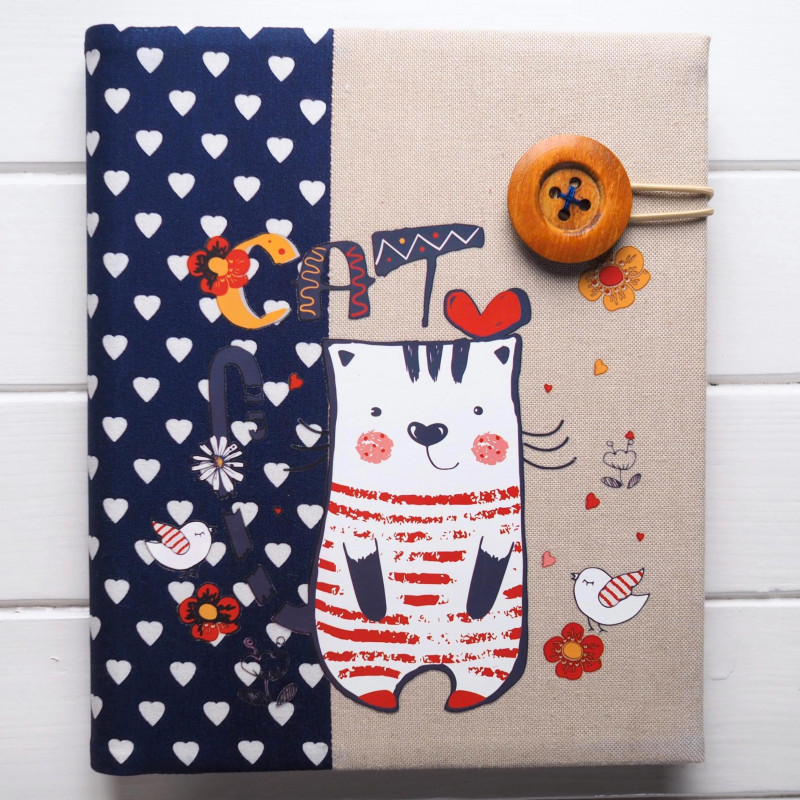 Pro malou holčičku (nebo jako milý dárek k narození miminka) je tohle album roztomile hravé – kočička v pruhovaném tričku, modrý pruh se srdíčky a drobné kytičky s ptáčky působí vesele a něžně. Je ideální na první fotky, milníky, oslavy i všechny drobnosti, které si chcete schovat z dětství.