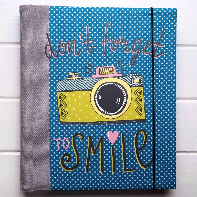 Toto handmade fotoalbum je pro všechny, kteří si rádi uchovávají vzpomínky z cest, výletů, oslav i obyčejných dnů. Veselý motiv foťáku s nápisem „Don’t forget to smile“ z něj dělá milý dárek i pro někoho, kdo „už všechno má“.