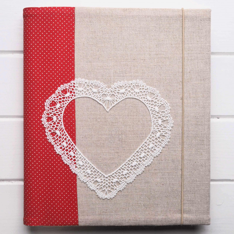 Přírodní len doplňuje červený puntíkatý pruh a velké krajkové srdce, takže album působí lidově, romanticky a přitom vkusně. V obýváku udělá radost i jako dekorace – něco, co chcete mít na očích, ne schované ve skříni.