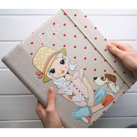 Pro malou holčičku, která miluje zvířátka a pohádkové obrázky, je tohle album opravdu kouzelné – velká ilustrace holčičky v klobouku, věrný pejsek po boku a drobná červená srdíčka po celé obálce. Když přidáte jméno, album se promění v osobní vzpomínkový „deník“ plný prvních fotek a okamžiků, ke kterým se budete chtít vracet ještě dlouho.
