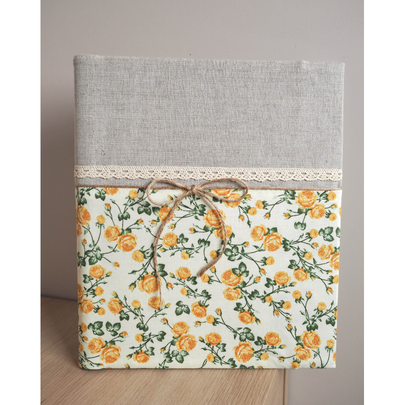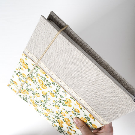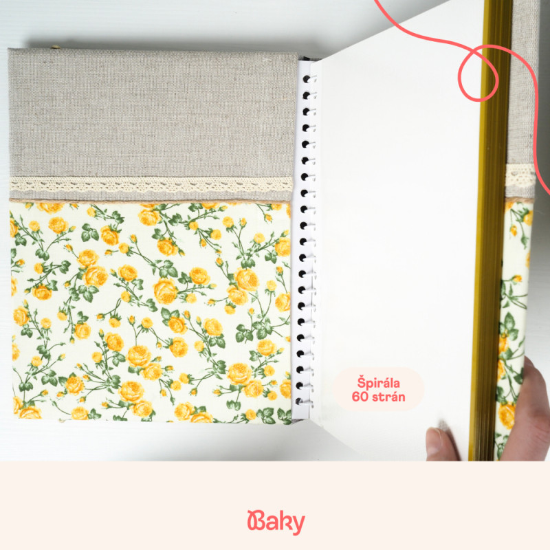 Každý kus šijeme ručně v malé rodinné dílně na Slovensku, proto se může v detailech jemně lišit. Gumička album pevně uzavře a drží tvar i ve chvíli, kdy je plné.