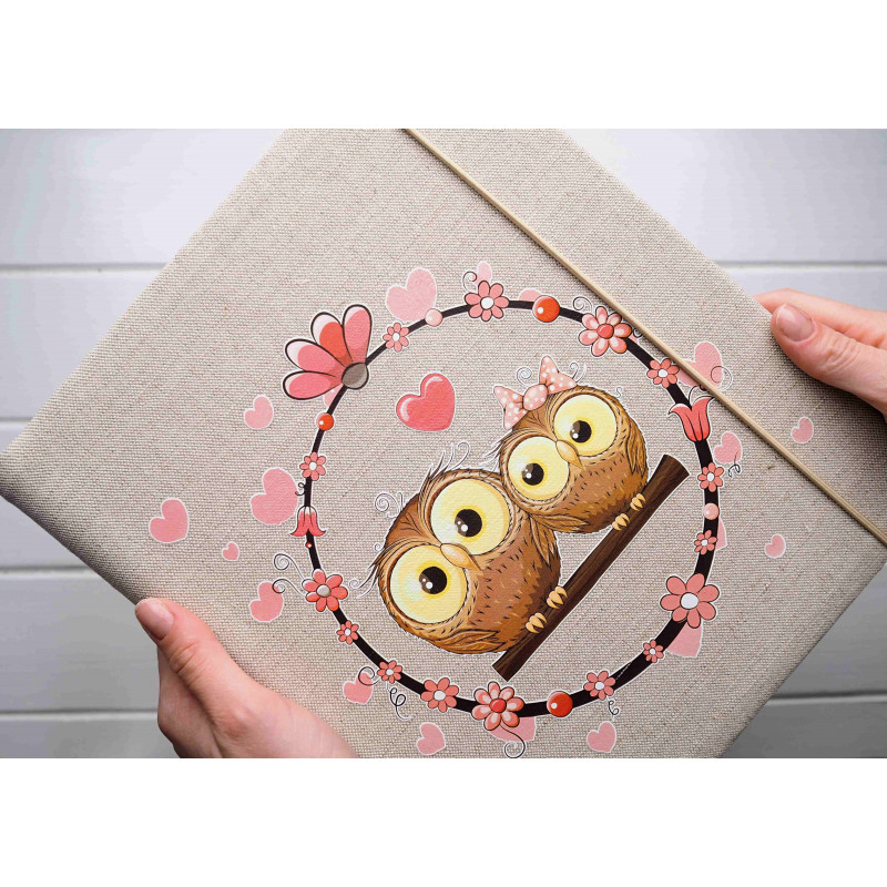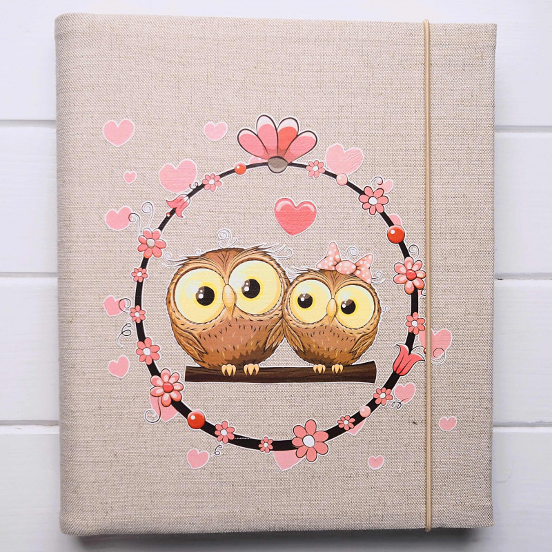 Pro malou romantickou holčičku (nebo jako milý dárek pro maminku s miminkem) je tohle album roztomile něžné – dvě sovičky v květinovém věnečku, růžová srdíčka a drobné kytičky působí sladce a hravě. Je ideální na první fotky, společné chvíle, oslavy i vzpomínky, které chcete mít hezky pohromadě.