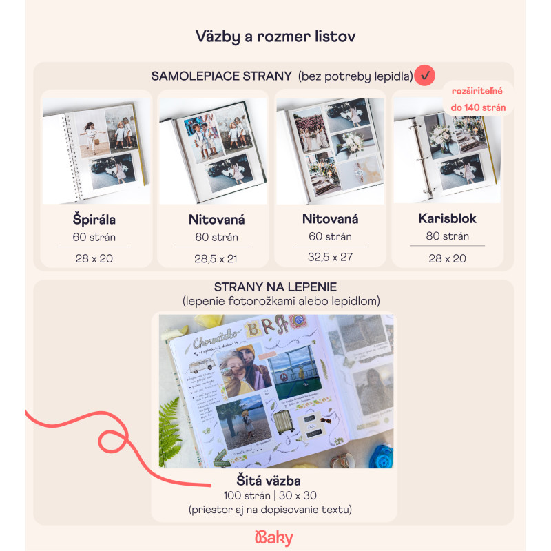 Zvolíte si i počet listů 30–70 (=60–140 stran). Vhodné pro fotky 9×13, 10×15, 13×18 i Polaroid/Instax.