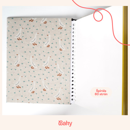 Na obálce jsou drobné husičky na béžovém podkladu, působí jemně a hravě. Doma vypadá přirozeně, hlavně ve světlém, přírodním nebo venkovském stylu – a na poličce udělá hezkou tečku.