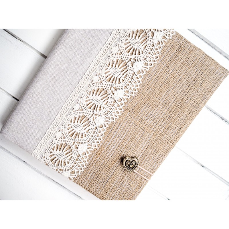 Album ručně šijeme v malé rodinné dílně na Slovensku. Každý kus je vyráběný ručně a může se v detailech jemně lišit. Kombinujeme pevný len (len je vyrobený v ČR) s jutou a zapínání na gumičku udrží album zavřené i tehdy, když je plné.