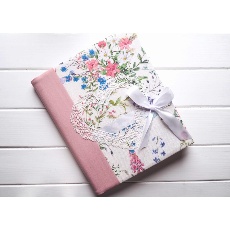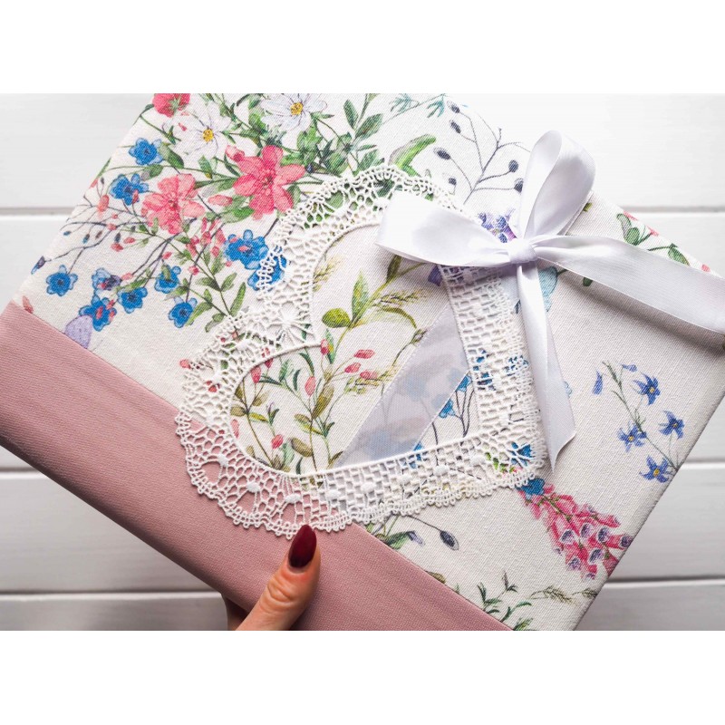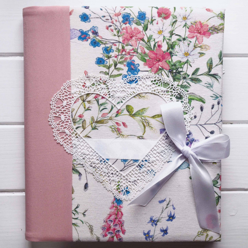 Něžné romantické album, které vypadá krásně i vystavené. Růžový hřbet, motiv lučních květů a krajkové srdce doplněné bílou saténovou mašlí působí slavnostně a jemně – perfektní na svatební fotky, výročí, zásnuby i jako rodinné album plné každodenních vzpomínek.