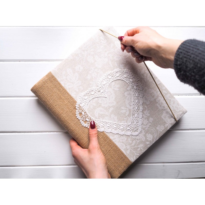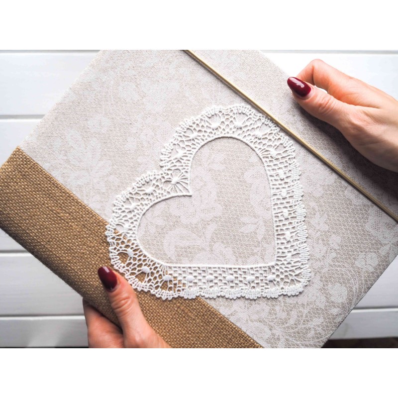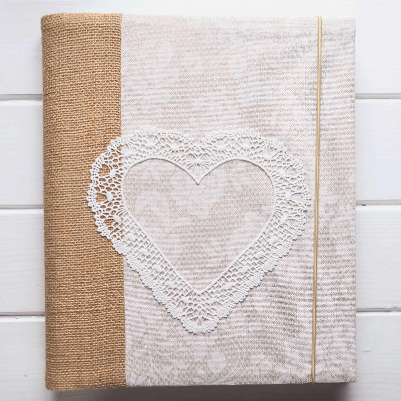 Jemné světlé album s jutovým hřbetem a krajkovým srdcem působí romanticky a přitom přirozeně. Skvěle se hodí na svatební fotky, rodinné vzpomínky i chvíle, ke kterým se chcete pořád vracet. Krásně vynikne v ložnici i v obýváku – klidně ho nechte vystavené na poličce, bude dělat radost i jako dekorace.