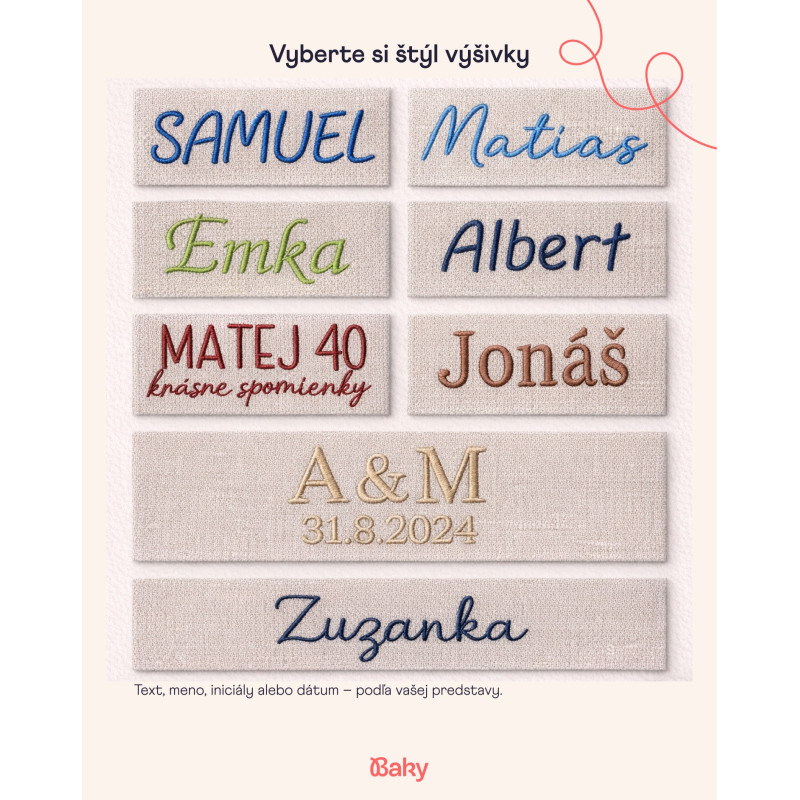 V případě, že máte zájem o konkrétní umístění textu prosíme uvést to do poznámky. Můžete nám tam také doplnit velikost, barvu či typ písma. Ukázky najdete sem https://www.fotoalbumybaky.sk/blog/ novinky/dětsky-fotoalbum-s-jménem Můžete to ale také nechat na nás. Ke každému nápisu přistupujeme individuální. Látky i vyšívací nitky máme přímo před očima. Zkoušíme různá písma a volíme vždy to, co zapasuje nejvíc.