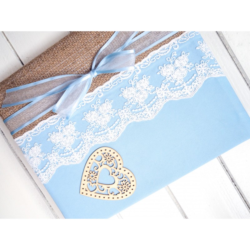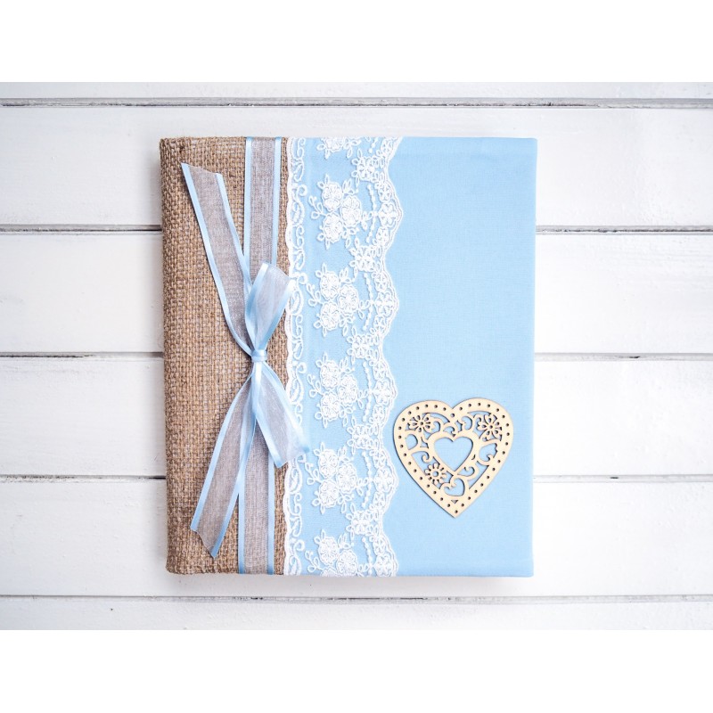 Pro nevěstu, která miluje jemné detaily a tradice („něco modrého“), je tohle album jako stvořené – světle modrý obal s krajkovým pruhem, jutovým hřbetem, mašličkou a dřevěným srdíčkem působí něžně, svatebně a velmi elegantně. Hodí se na fotky ze svatby, příprav i líbánek a krásně zapadne do interiéru na polici v ložnici nebo obýváku.