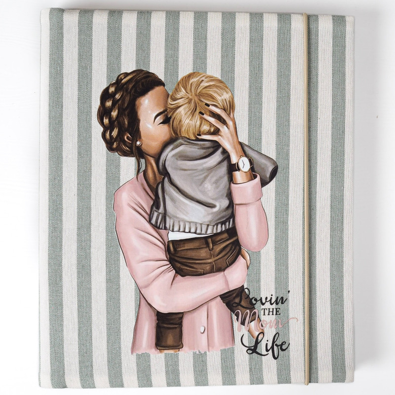 Obal s ilustrací mámy a dítěte na decentním pruhovaném podkladu působí citlivě a nadčasově. Každý kus je ručně vyráběný v malé rodinné dílně na Slovensku, proto se může v detailech jemně lišit. Album se uzavírá gumičkou, která drží tvar i při plném zaplnění.