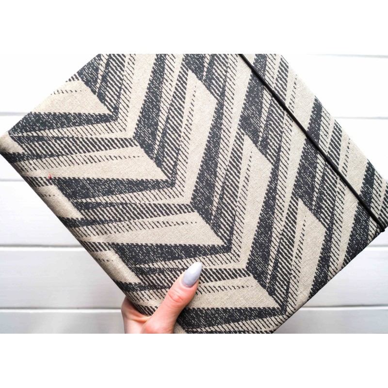 Obal zdobí výrazný chevron (zig-zag) vzor v černé na přírodním podkladu. Je nadčasový a neutrální, takže zapadne do moderního, industriálního i skandinávského interiéru – v obýváku nebo pracovně působí jako pěkný doplněk.