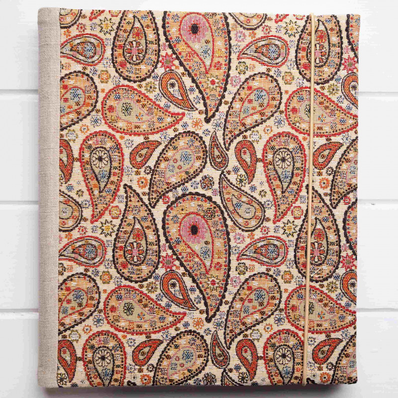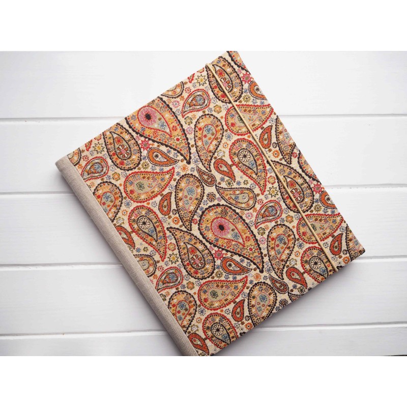 Obal je z gobelínu s uměleckým orientálním vzorem v teplých odstínech, doplněný lněným hřbetem. Krásně vynikne v útulném i boho interiéru, hodí se do obýváku i ložnice a klidně poslouží i jako dekorace.