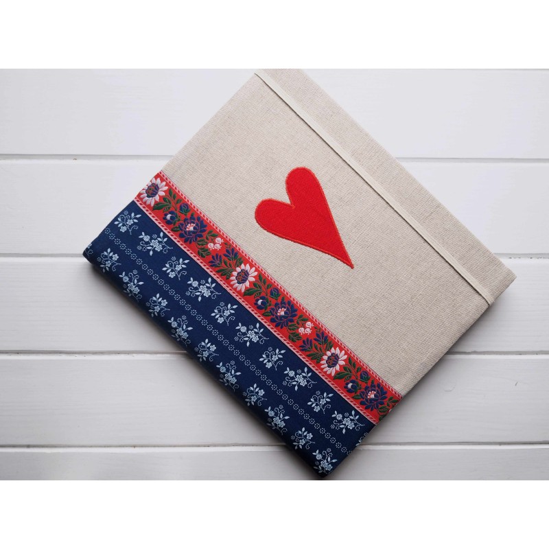Kombinace přírodního lnu, modrého vzoru a folklórního pruhu působí krásně a přitom vkusně. Červené srdce uprostřed je jasný vzkaz – tohle jsou naše chvíle. V obýváku vypadá nádherně a často zůstává vystavený jako dekorace.
